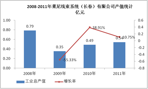 2008-2011年,莱尼电气系统(长春)有限公司产值规模扩大,2011年企业产值超过0.5亿元。预计未来几年,企业产值规模将扩大。
