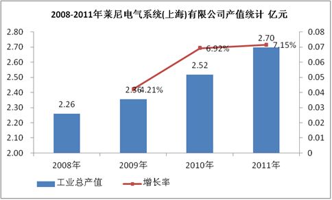 2008-2011年,莱尼电气系统(上海)有限公司产值规模扩大,2011年企业产值超过2.7亿元。预计未来几年,企业产值规模将扩大。