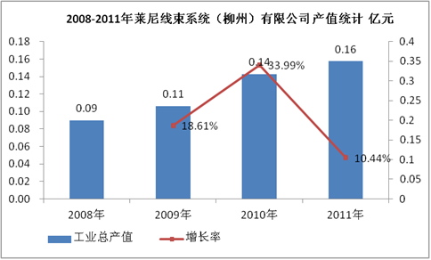 2008-2011年,莱尼电气系统(柳州)有限公司产值规模扩大,2011年企业产值超过0.16亿元。预计未来几年,企业产值规模将扩大。