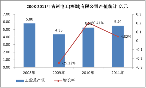 古河集团公司在中国地区有近三十家投资公司,在日本有200多年历史。古河电工(深圳)有限公司作为古河重要子公司,产值规模较好发展,2011年企业产值规模5.49亿元,预计未来几年公司产值规模将持续增长。