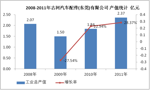 古河汽车配件(东莞)有限公司隶属于日本古河汽车配件有限公司,企业产值规模扩大,2011年企业产值达到2.37亿元,预计未来几年企业产值规模将扩大。