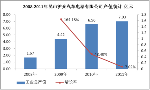 昆山沪光汽车电器有限公司是中国民营资本较大的集产品研发、制造、服务为一体的线束专业生产企业。企业产值增速较快,尤其是2009年,产值增长率达到164.18%2011年企业产值超过7亿元,预计未来几年企业产值规模将利好发展。