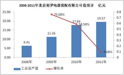 图表 162008-2011年北京裕罗电器装配有限公司产值统计  亿元