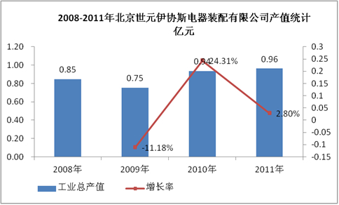 图表 182008-2011年北京世元伊协斯电器装配有限公司产值统计     亿元