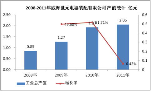 图表 192008-2011年威海世元电器装配有限公司产值统计   亿元