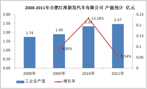 图表 222008-2011年合肥江淮新发汽车有限公司  产值统计   亿元