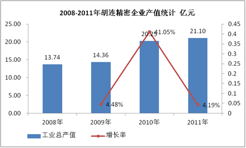 图表 232008-2011年胡连精密企业产值统计  亿元